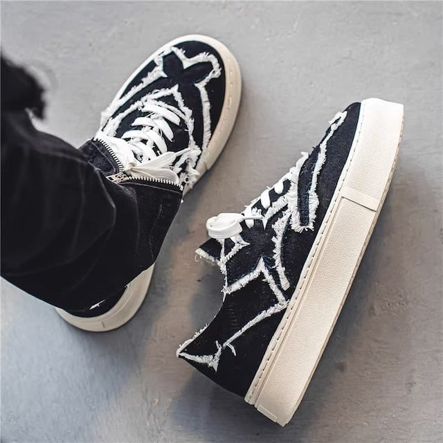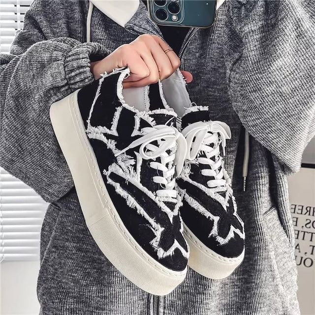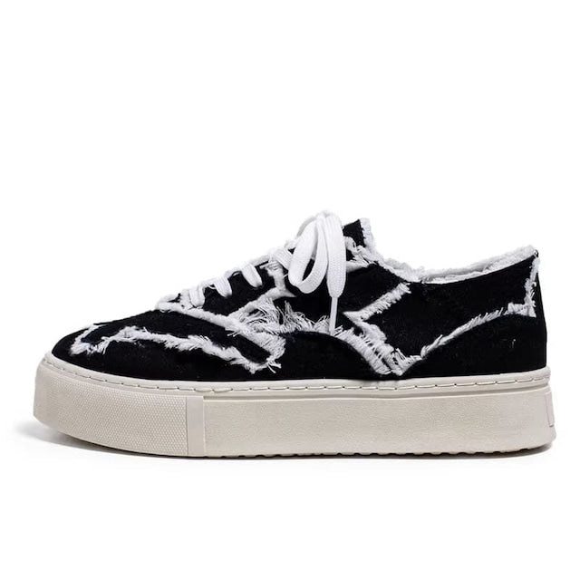 厚底デザインとユニークなダメージ加工が特徴のスニーカー。